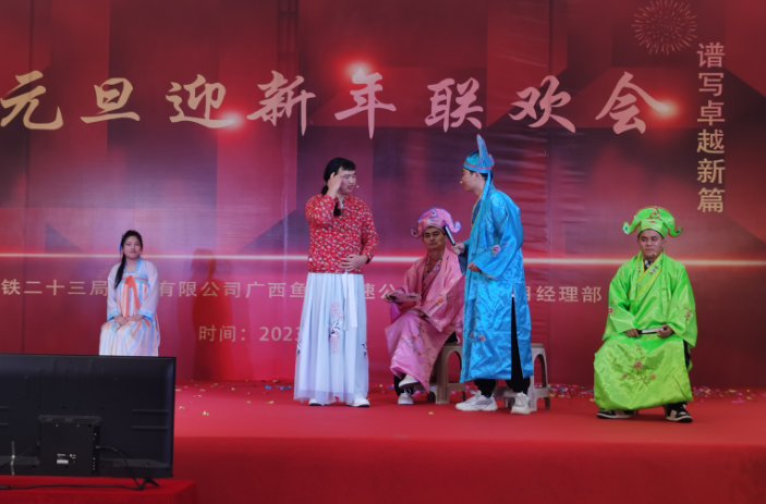 目前,受寒潮带来全国性的大降温,该项目所在的广西来宾忻城最高气温仅有4度左右,虽然天气寒冷刺骨,但是项目部活动中心内却春意浓浓,热闹非凡。下午15时许,在一曲《灯火里的中国》的欢快舞蹈中拉开了联欢会的序幕,接下来先后表演了舞蹈、小品、武术、舞狮、诗朗诵、三句半、独唱、小合唱等形式的节目,中间还穿插了小游戏、猜谜语、抽奖等互动环节。17时10分左右,在项目部门负责人和项目领导班子一首《铁道部战士志在四方》的大合唱中结束,这首歌曲深情地再现了这支由兵改工传承下来的建筑施工企业逢山凿路、遇水架桥,铁道兵前无险阻;风餐露宿,沐雨栉风,铁道兵前无困难的大无畏精神,展现了当代中国铁建的建设者们继承老一辈铁道兵战士的光荣传统,誓把鱼宜高速公路项目建成优质品牌工程,为中国铁建争光,为中铁二十三局集团争誉,为广西人民造福的雄心壮志和豪壮气魄。