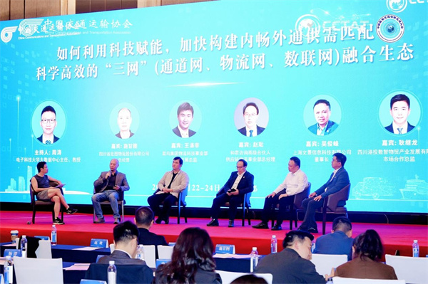 四川省宏图物流股份有限公司总经理施甘图、菜鸟集团物流科技事业部行业发展总监王涤非、和君咨询高级合伙人、供应链物流事业部总经理赵玭、上海文景信息科技有限公司董事长吴俊峰、四川港投数智物贸产业发展有限公司总监耿继龙围绕如何利用科技赋能,加快构建内畅外通、供需匹配、科学高效的“三网”(通道网、物流网、数联网)融合生态展开圆桌讨论。电子科技大学大数据中心主任、教授周涛担任主持人。
