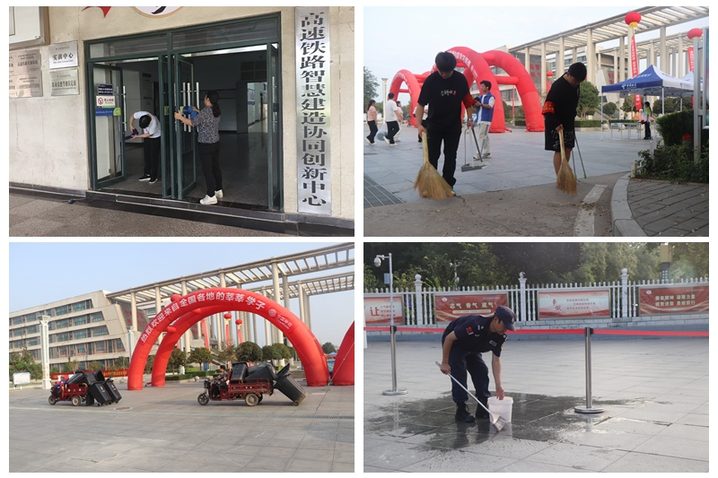 为让新生踏入校园的第一刻便能感受到“家一般的温暖”,该校保洁人员、劳动班学生与保安人员联动发力,共同维护校园环境整洁。保洁人员操作专业清洁设备,对楼宇地面进行细致清扫,认真擦拭玻璃门,及时清运垃圾,确保每一处角落都整洁明亮;劳动班学生手持扫帚、簸箕,在校园广场、主干道上逐一清理杂物,不放过任何卫生死角;保安人员在坚守岗位的同时,也主动加入卫生维护行列,仔细擦拭校园南门外地面,用实际行动为新生营造清爽、整洁的报到环境。