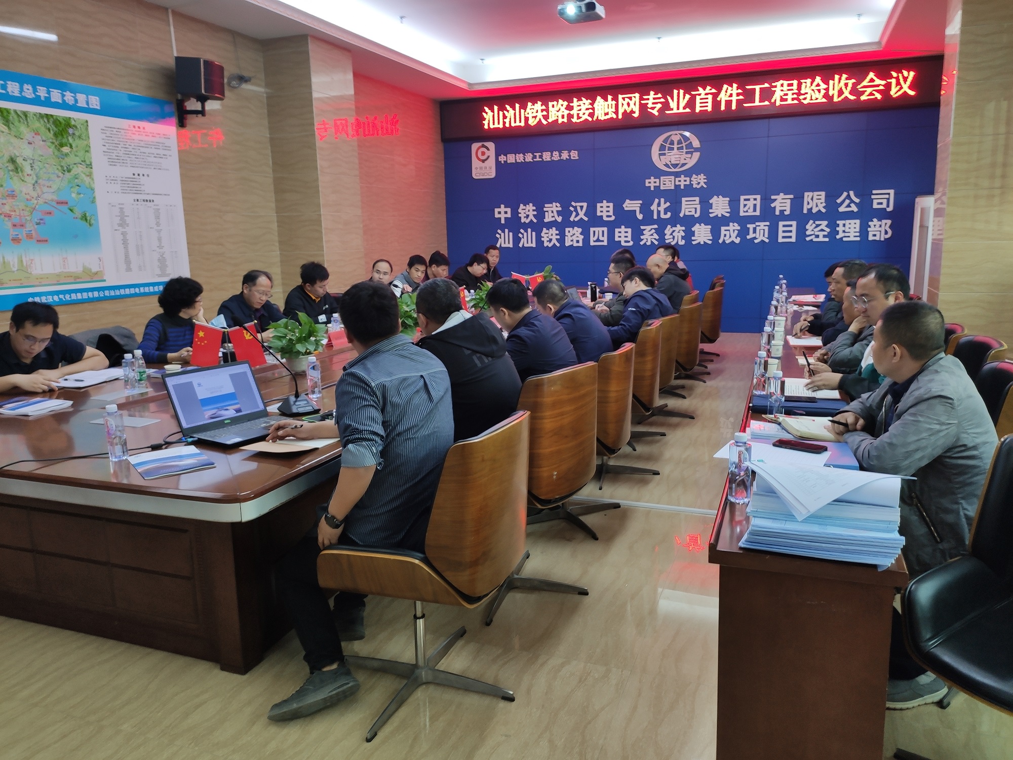 广汕铁路有限公司根据中国铁路总公司《铁路建设项目首建工程评估管理办法》铁办工管(2022)26号及该首件工程评估管理办法(修订),2023年2月28日上午,专家组一行通过实地、实体对汕汕铁路陆丰东站至惠来站区间 40、42 锚段( 780#-882#,里程 DK72+319-DK74+812)-鳌江特大桥接触网支柱安装,支柱装配,下锚补偿装置安装,承力索、接触线架设,吊弦及吊索安装,中心锚结安装,电连接线安装等逐一察看检查。28日下午,在中铁武汉电气化局集团公司汕汕铁路四电系统集成项目经理部驻地召开了首件评估验收总结会,所有参加首件评估的建设、设计、设备管理、监理单位的专家领导,就实体检查情况在总结会上给出建议。