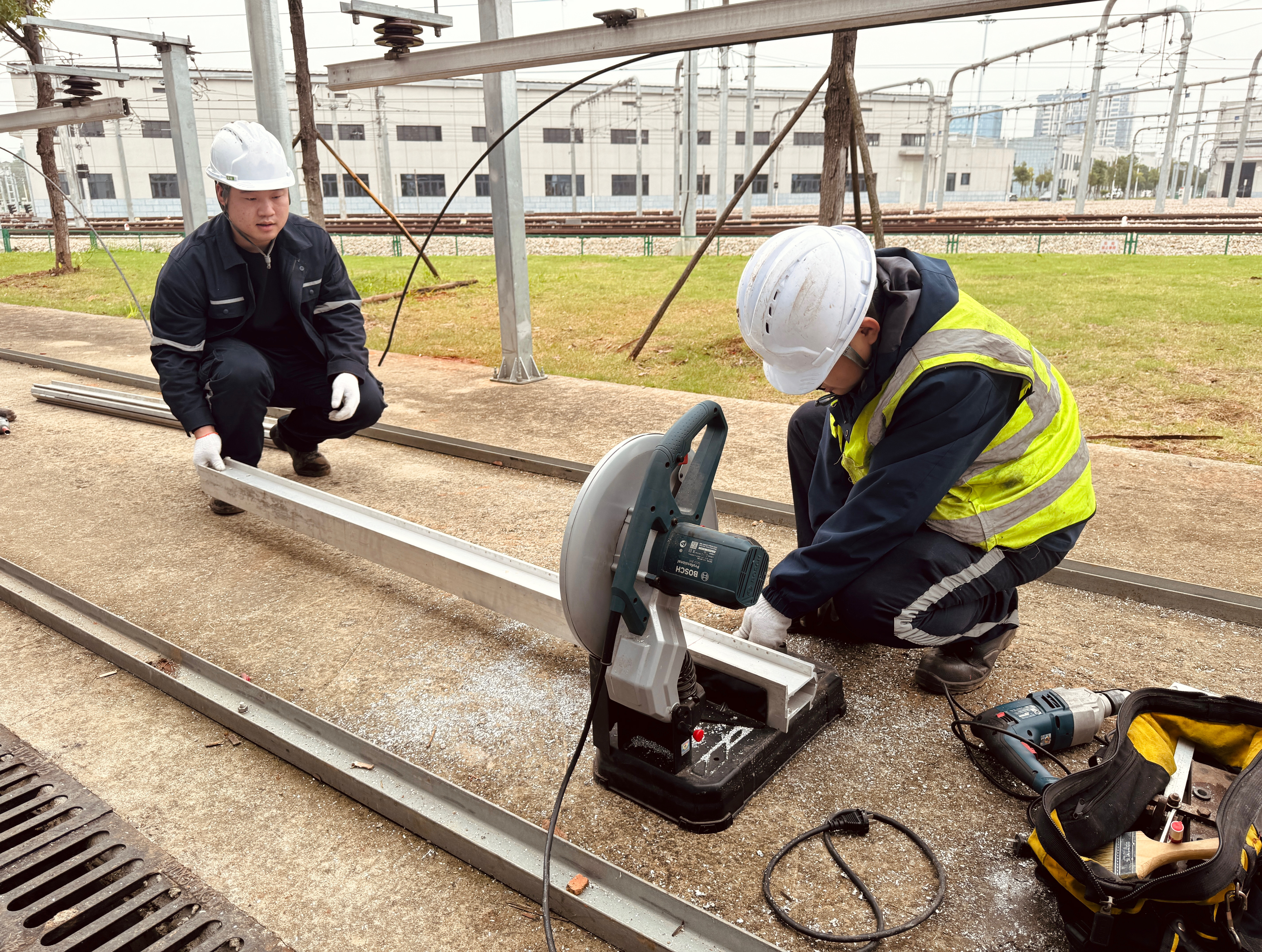 练兵场上,来自一线工班的11名选手齐聚赛场、同台竞技。此次比武设置理论考试和实操考试两大环节,理论考试紧扣接触网理论知识,深度考察选手对专业理论的理解程度与应用能力;实操考核则聚焦刚性接触网汇流排更换及中间接头制作、柔性下锚绝缘子更换等核心作业内容,全方位检验选手的操作熟练度及临场应变能力。
