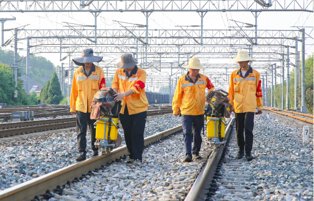 高温酷暑下的坚守,为线路安全畅通提供保障。烈日似火,焦金烁石,铁路职工不畏炙热,坚守岗位。面对暑运期间持续高温天气,列车高密度运行的情况,工务部门把确保线路质量稳定畅通列为当前安全工作的重中之重,采取多项举措提升线路“免疫能力”。为了检查钢轨轨面、焊缝以及道岔心轨、尖轨等重要部件是否伤损,探伤作业人员在有限的180分钟“天窗”内推着重达80多斤的钢轨探伤仪,按照每小时不超过5公里的速度前行。遇到道岔重点部位时,需进行手工检查,不放过一丝可疑之处。“蹲、站、猫腰、侧身、探身、前行……”探伤位置轻微调整一处,人就要不断变化姿势。一场天窗下来,作业人员面上布满了汗水,衣服印上了一道道黑色印迹。透过这些高温下依旧忙碌的身影,看到的是他们肩上扛着的责任与使命,感受到的是铁路人对“确保高铁和旅客安全万无一失”的执念。